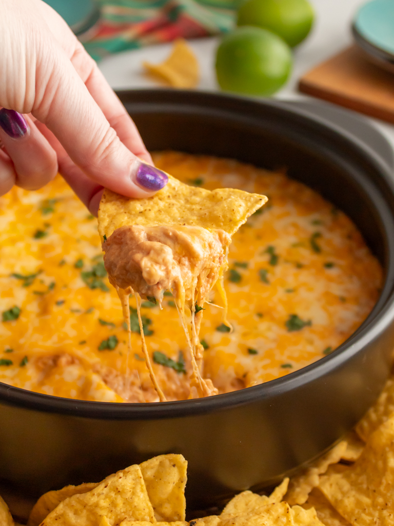 After the dip is melted, switch your crockpot to warm so it stays hot and ready for snacking.